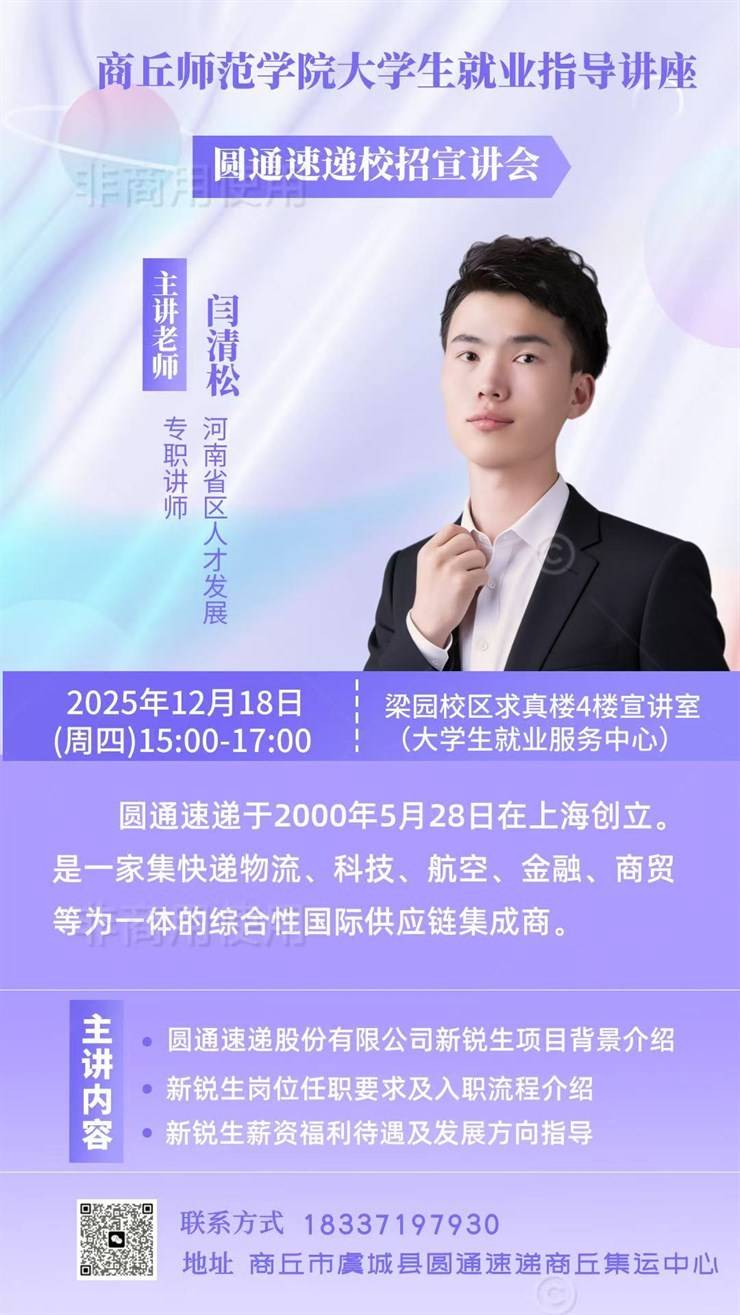 宣讲主题:商丘师范学院大学生就业指导讲座—圆通速递校招宣讲会